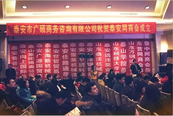 2015年1月26日,泰安市網(wǎng)商協(xié)會成立大會在泰安寶龍福朋酒店隆重舉行。參會的有泰安市政府領(lǐng)導、泰山區(qū)區(qū)委書記和阿里巴巴北方區(qū)域、泰安市商務(wù)局、泰山區(qū)商務(wù)局、市建行、泰山學院、山東科技大學、市外網(wǎng)商會等多家單位的主要領(lǐng)導以及泰安網(wǎng)商會全體會員。